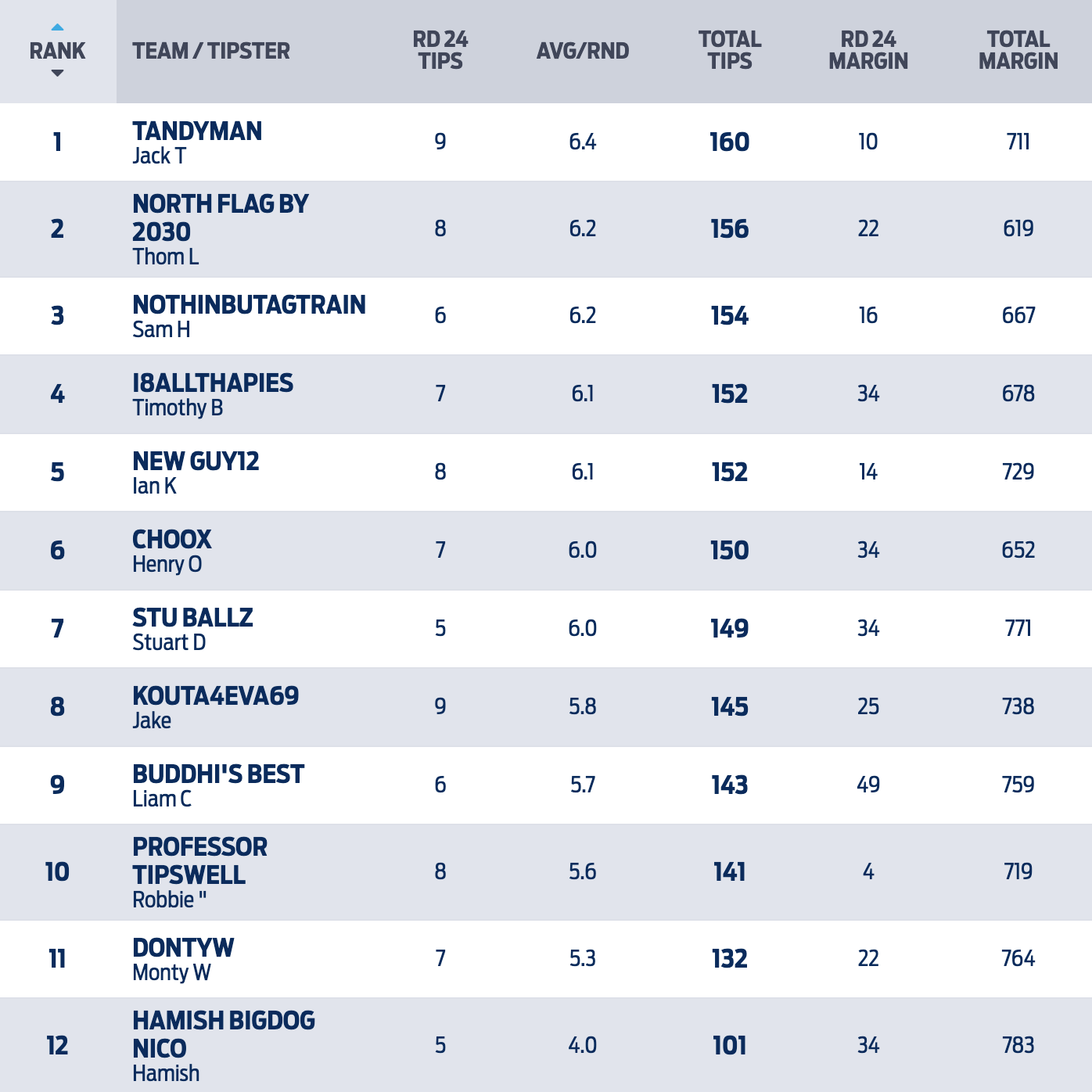 Jack "Tandyman" Tandy was the overall winner on 160, Thom "North Flag by 2030" Lidgerwood was a steady runner up on 156 and Sam "NothinbutaGTrain" Haughton-Greene stormed home stronger than Nasiah Wangeneen-Milera vs Melbourne to round out third place on 154.