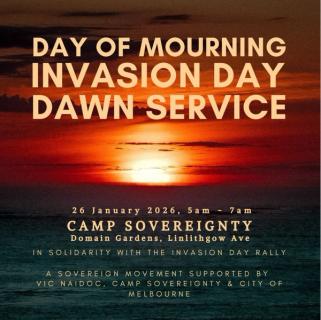 Lucy Tsipouras invites you to join the upcoming invasion day dawn service this coming Monday, 5am @ Camp Sovereignty, Domain Gardens. More information on the event as well as information on other local invasion day events & protests can be found >>here<<