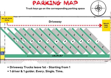 - First M truck to return parks in 11, then 10 etc, then XL carpark.