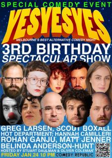 Melbourne's best alternative comedy night, YESYESYES, is turning 3βand we're throwing a crazy good party show you won't want to miss! Celebrate three years of weirdness, characters and brilliance with this crazy-good lineup of the best and some of most award-winning comedians in Melbourne. Expect surprises, big laughs, and the kind of unforgettable night only YESYESYES can deliver. Come for the crazy good comedy, stay for the crazy good vibes.