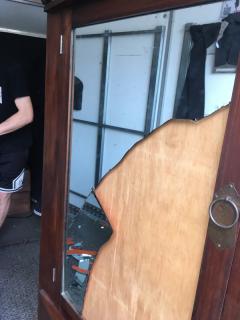 This rather large and awkward cabinet door was broken during the unload as it swung open, impacting another item in the truck and shattering the thick glass. The team submitted a solid damage report with good pics before chatting options with the customer. Understandably not super keen on a discount, they opted for a repair so it was off to the glazier to replace the damaged glass. A few weeks later and it's looking good as new, ready for delivery back to a less broken hearted individual.