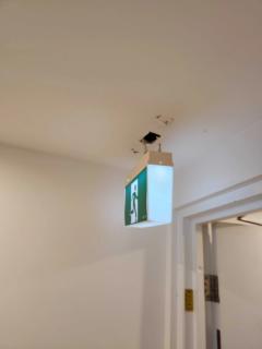 A damage classic this issue with an exit sign knocked loose by a tall item. Remember to keep an eye out for any lights and signage above you when transporting large items like couches that may impede your view.
